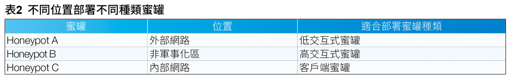 蜜罐的放置位置取決於它的複雜程度或是功能,放防火牆外的外網風險最高,最容易被攻破成為駭客的跳板;放在防火牆後,內網之前的DMZ可以由防火牆擋下大部分流量,只允許特定流量前往蜜罐;放置在內網,則是專門捕捉內部攻擊者,因為內網流量不是隨隨便便就能透過外網接觸到的。無論如何放置,都應該與真實環境有一定程度的隔離(圖3、表2)。
