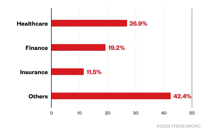 RA World勒索病毒(原名RA Group)自2023年4月首度現身以來已在世界各地成功入侵了多家機構。儘管駭客集團的攻擊範圍頗大,許多攻擊目標都集中在美國境內,少數分布在其他國家,如德國、印度和台灣。在產業方面,該集團主要瞄準醫療與金融機構,如圖1、圖2所示。