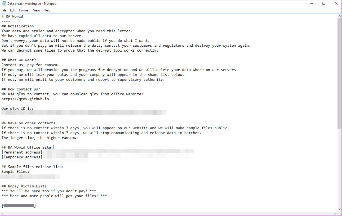 儘管Babuk早在2021年就已「退役」,但由於該集團的原始程式碼遭到外流,使得多個新的駭客集團能夠輕鬆進入勒索病毒這個領域,RA World勒索病毒集團就是一例。除了勒索病毒服務(RaaS)的出現之外,像這樣原始碼外洩的案例,也讓勒索病毒集團的進入門檻變低,就連缺乏必要技術能力和知識的網路犯罪集團也能開發自己的勒索病毒家族來經營不法事業。