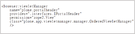 範例內的若使用manager=".interfaces.IPortalHeader"的話,就是歸屬plone.portalheader的Viewlet。