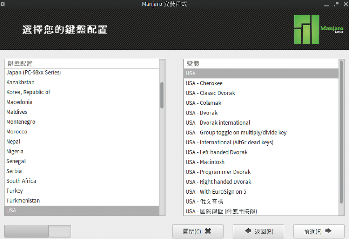 如圖15所示,來到「選擇您的鍵盤配置」頁面後挑選所要使用的鍵盤語系配置,再按下〔前進〕按鈕。