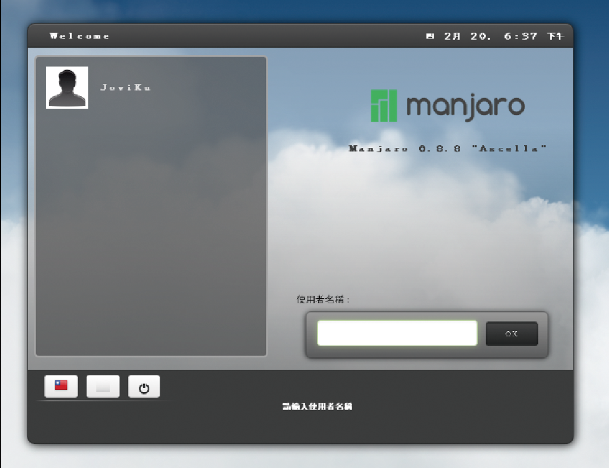 圖19所示便是Manjaro Linux使用者的登入介面,在此輸入安裝時所建立的使用者名稱與密碼。