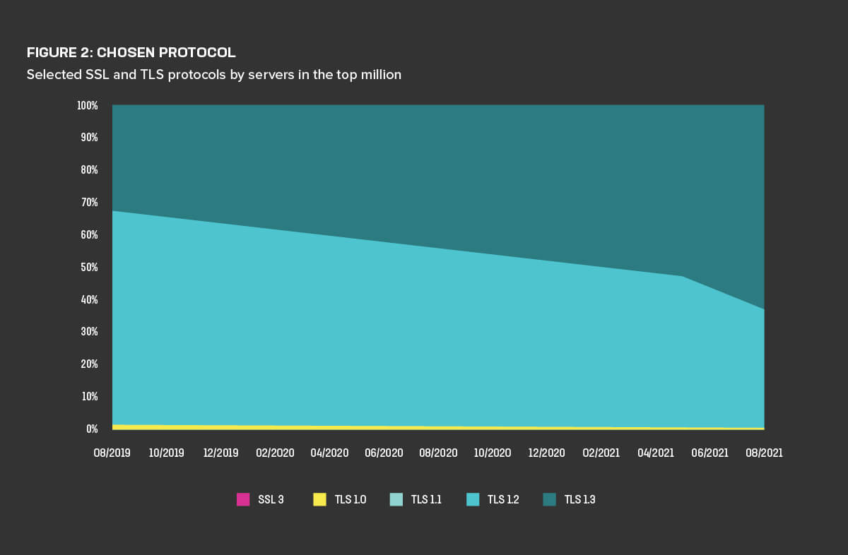 2021年5月TLS 1.3首次攀升為前一百萬Web伺服器中大多數選擇的加密協議。