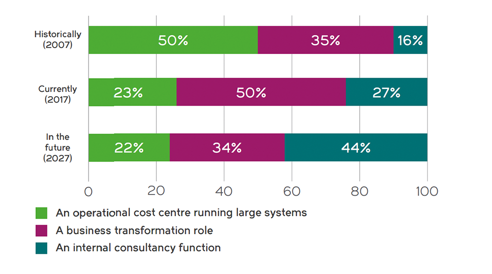 IT部門的目的是要發展成一個更具策略性的中心角色功能,這意謂著必須具備廣泛的能力,然而,這些技能不見得都會被賦予優先性。調查顯示,受訪者平均只有15%的時間花在新技能學習。