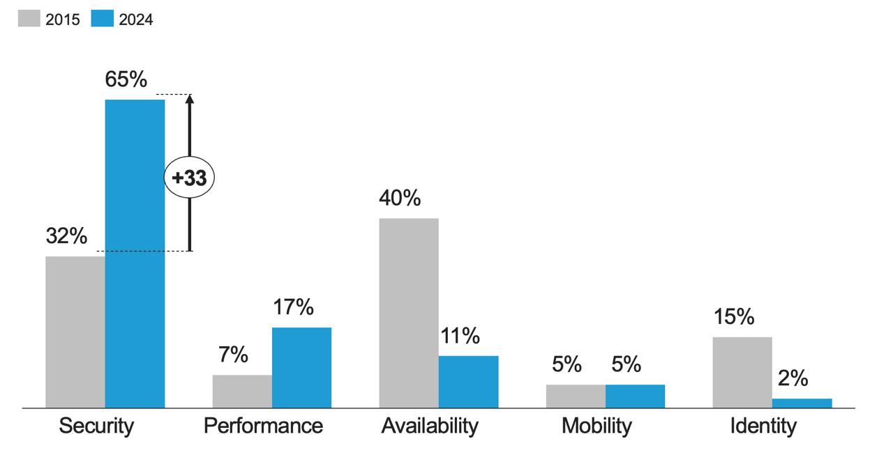 安全技術不可或缺,雖然身分和存取技術仍然是最常部署的類別,但受訪者表示他們最不能放棄的就是與安全相關的服務。無論屬於哪個類別,大多數(66%)的應用交付和安全技術都部署在雲端。公共部門、醫療保健和大型企業更有可能在本地部署它們,SaaS交付和邊緣託管也相對常見(圖6)。