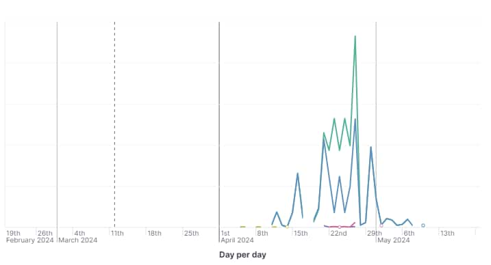 本次觀察到的,涉及特定惡意軟體伺服器的整體活動的時間範圍從2024年4月初到2024年5月初,並且至少從4月21日起就開始採用PAN-OS CVE(圖12)。