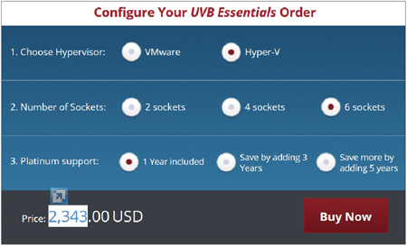 現階段,UVB有三種版本可供選擇,包括Essentials、Professional以及Enterprise。這其中,Essentials版本算是非常優惠的配套方案,目標鎖定在6顆處理器的使用環境。Unitrends官方網站公布簡易計費的數據,不管選擇VMware或Hyper-V任一虛擬化平台,在6顆處理器環境搭配一年維護支援,計價為2,343美元。另外,只有Enterprise版本才提供多種不同環境的管理,可以在單一管理介面看到。