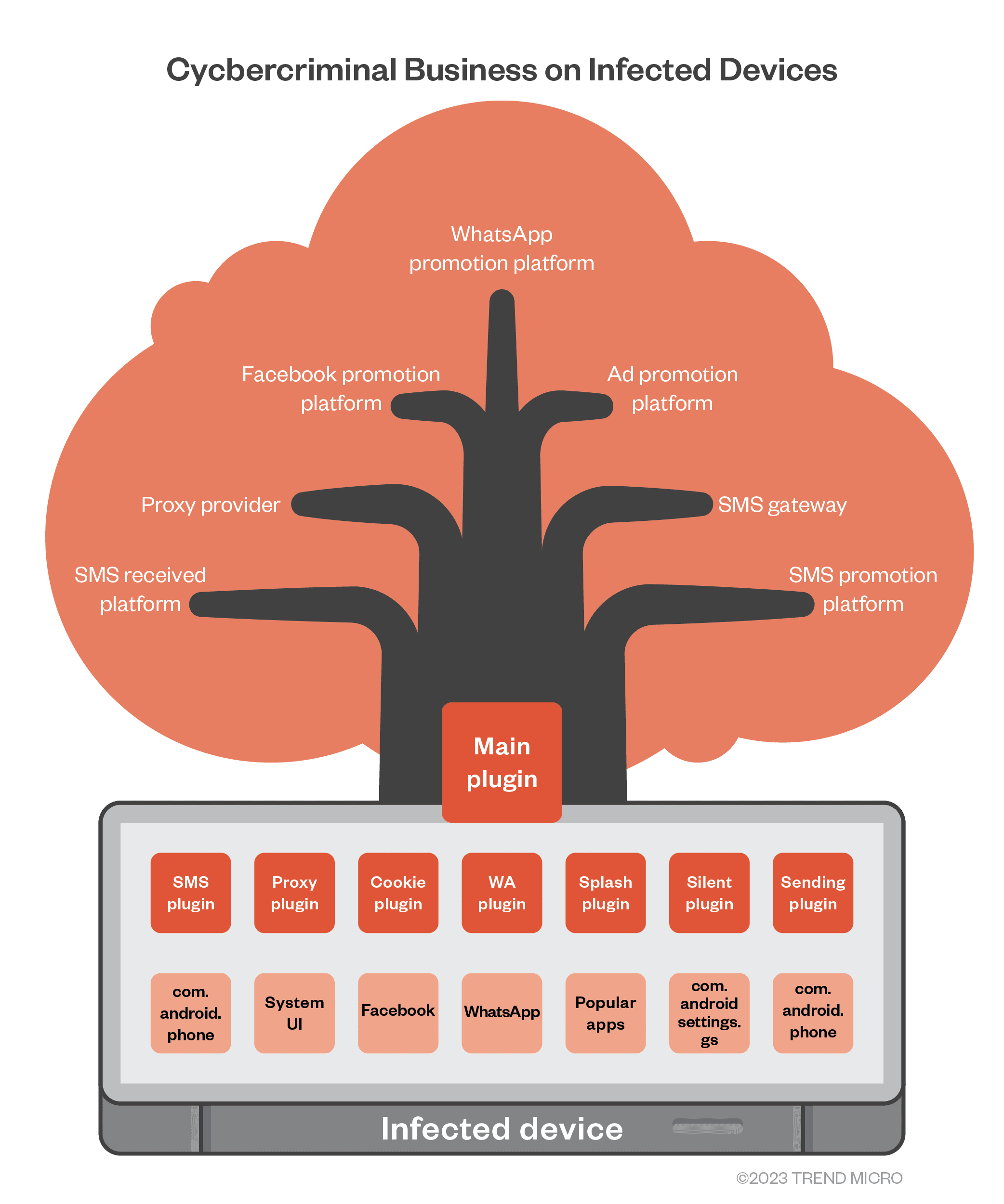 目前已經找出其不同賺錢手法所對應的犯罪事業,例如利用被感染手機上的Silent擴充功能顯示大量廣告、在智慧型電視顯示廣告,以及在Google Play應用程式當中暗藏廣告。相信駭客也可能竊取受感染裝置的資訊來賺錢,並累積成大數據資料庫來賣給其他駭客集團,作為另一種感染後的賺錢手段。