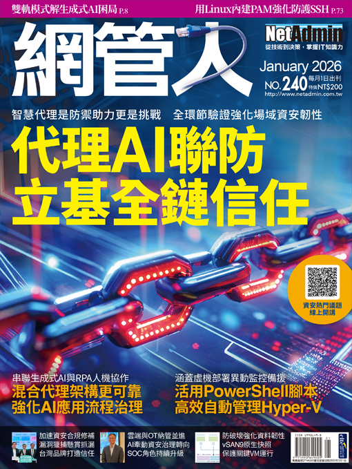 ● 雙軌模式解生成式AI困局 ● 混合代理架構更可靠 強化AI應用流程治理 ● 活用PowerShell腳本 高效自動管理Hyper-V ● 入侵週期加速 平台化防禦有解 ● AI牽動資安治理轉向 SOC角色持續升級