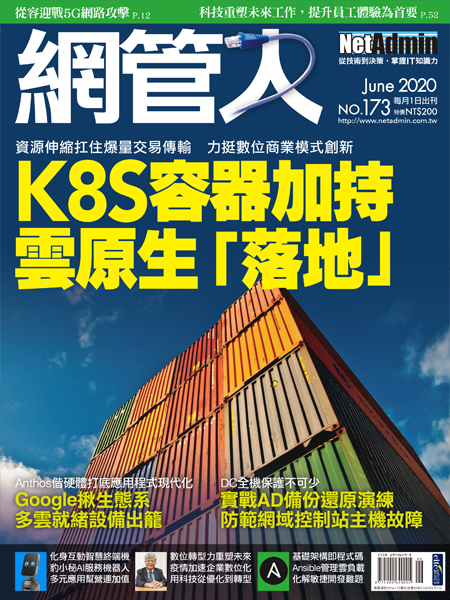● Google揪生態系 多雲就緒設備出籠 ● 實戰AD備份還原演練 防範網域控制站主機故障 ● 從容迎戰5G網路攻擊 ● 新科技重塑未來工作 提升員工體驗為首要任務 ● AI服務機器人 幫企業營運加值 ● 新冠疫情加速企業數位化 善用科技從優化到轉型 ● 化解敏捷開發難題 Ansible輕鬆管理雲負載