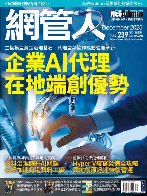 ● AI碳帳轉型助獲利合規 ● 資料治理躍升AI關鍵 企業加速打造資料工廠 ● Hyper-V複寫災備全攻略 異地復原迅速恢復營運 ● 跨雲資料治理成AI焦點 一致性基礎平台助攻落地 ● 運算架構不再圍繞虛擬化 IT平台走向多雲自治