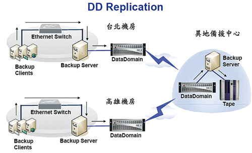 「EMC剛好同時有來源端以及目標端的重複資料刪除技術可以作為說明,以EMC在台灣的某LCD驅動IC設計業客戶為例,該公司有將近100台伺服器完全接收生產線上資料,這些資料為連續且細小檔案的傳輸,這就比較合適Avamar的應用,因為來源端的重複資料刪除技術,需要有代理程式放在伺服器端,當伺服器驅動Avamar時,就從伺服器上的資源去做重複資料刪除,然後再後送到Avamar的儲存設備,主要是節省伺服器到儲存設備中間的頻寬,可以針對比較細碎的小檔案,效能比較高。但位於台南與新竹的總公司內需要針對帳務系統、郵件、資料庫等等系統進行重複資料刪除時,則比較合適應用Data Domain。」