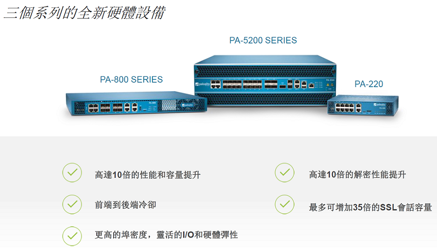 搭配PAN-OS 8.0推出的PA-5200系列,提供PA-5260、PA-5250、PA-5220,共三款實體設備。PA-5260機型主要是提供72 Gbps App-ID、30 Gbps威脅預防效能、6.5 Gbps SSL加解密吞吐量,適合為資料中心統合、閘道需求與檢測加密流量。