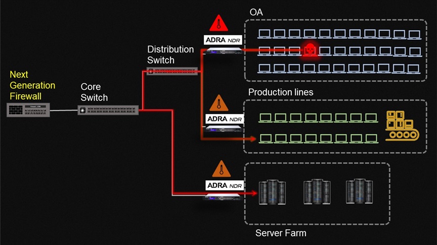 ADRA-3010P韌體搭載Hypervisor技術,啟用NDR虛擬主機後,接取ADRA-3010P設備的連線封包即可透過Mirror方式完整蒐集,經過深度封包檢測(DPI)解析內容,運用內建的快篩機制Threat Watch,依照條件過濾可疑網路活動並加以分析,並根據IT人員事先設定的應變原則做出反應,例如予以停止連接埠服務,當用戶發現網路中斷勢必得報修,此時IT人員即可順理成章介入調查,釐清來龍去脈。