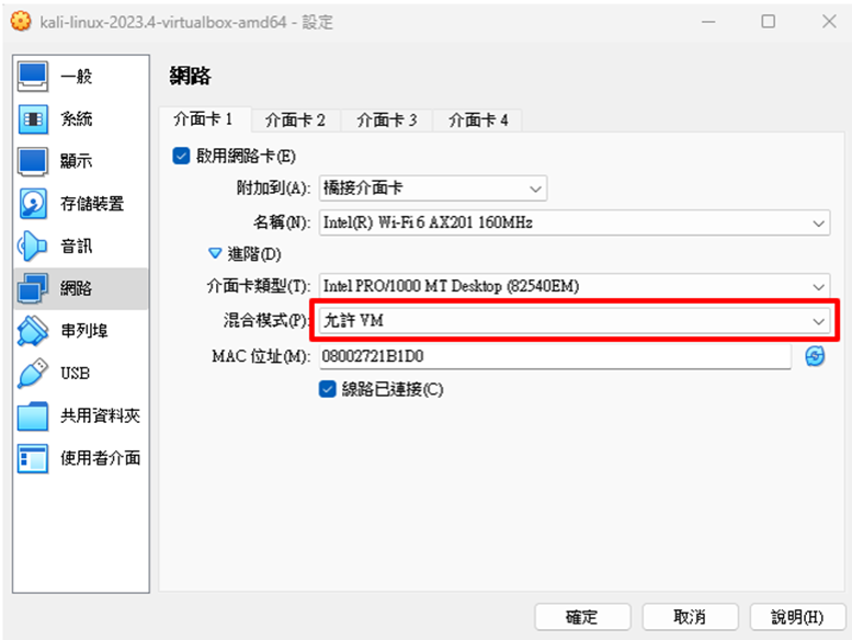 圖3 在Oracle VM VirtualBox的設定-網路-介面卡中修改Kali配置。