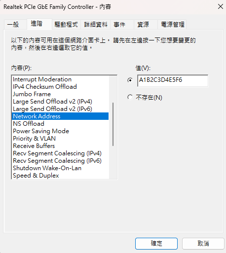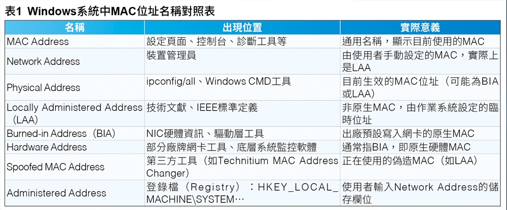 在Windows系統中,裝置管理員中的「Network Address」其實對應的是IEEE定義的Locally Administered Address(LAA),意即非硬體預設、由使用者指定的MAC位址。而在ipconfig/all等系統工具中,會顯示目前正在生效的MAC(無論是原生BIA或LAA)。因此,即便名稱不同,本質上都與目前使用的MAC位址有關,只是表達角度或技術層級不同。如表1所示,在不同的情境會使用不同術語。