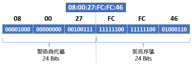 MAC(Media Access Control)位址,又稱「實體位址」或「硬體位址」,是指網路卡(NIC)在製造時所燒錄的唯一識別碼,長度為48位元,以十六進位表示,通常格式為XX:XX:XX:XX:XX:XX。其中,前24位元代表製造商代碼(OUI),後24位元則為裝置序號,如圖1所示。MAC位址在區域網路中扮演關鍵角色,為資料鏈路層(Layer 2)封包的發送與接收提供依據。交換器(Switch)透過學習各連接埠的MAC位址,建立對應的MAC Table,以實現封包的定向轉發,避免不必要的廣播,提高網路效率。