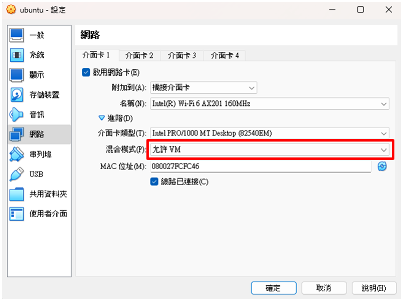 圖4 在Oracle VM VirtualBox的設定-網路-介面卡中修改Ubuntu配置。