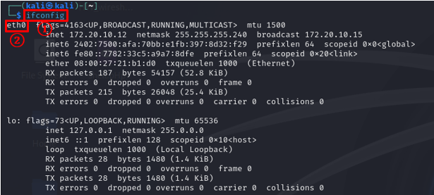 在使用macof封包之前,阿建先輸入「ipconfig」確認自己的網卡名稱,得知為「eth0」,操作步驟如圖6①、②所示。