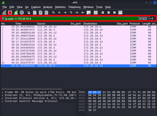 雖然成功發動MAC Flooding攻擊能夠側錄同一網段的所有電腦,但阿建只是想要讓阿明學到教訓,並不想過度侵犯其他同事的資訊隱私,所以阿建只鎖定阿明的電腦(IP位址為172.20.10.4)。在進行封包側錄時,阿建特意輸入指令「ip.addr == 172.20.10.4」,過濾出IP位址為172.20.10.4的封包,並在終端機輸入「ping 172.20.10.4」,確認封包傳輸狀況正常,操作步驟如圖5所示。