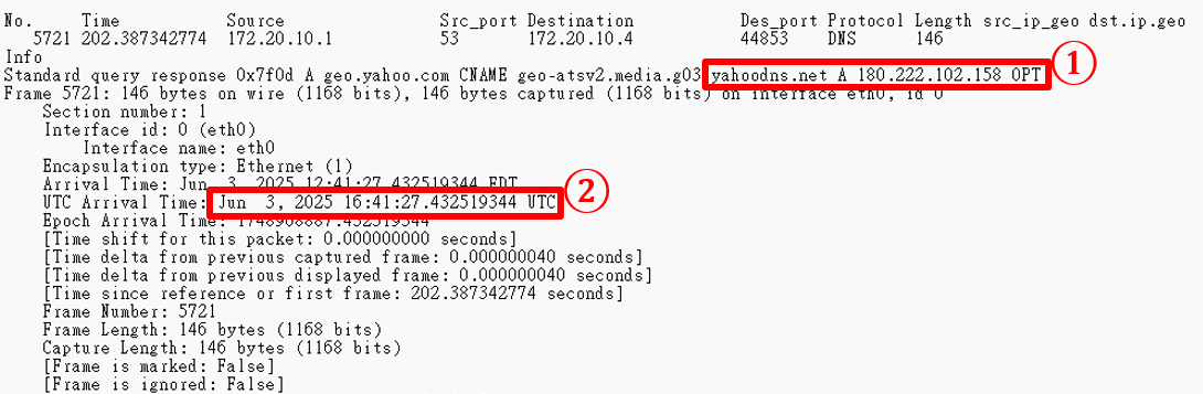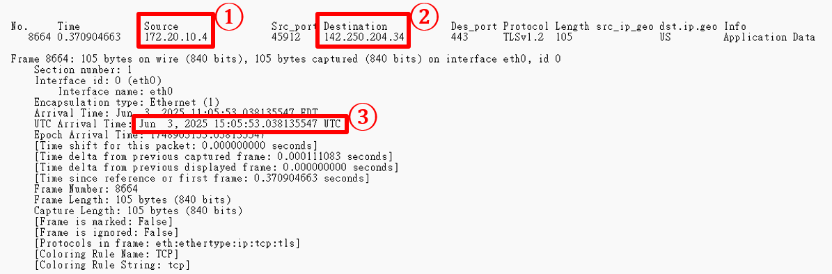 阿建利用Wireshark側錄發送給阿明的封包,輕鬆獲得阿明的上網足跡,並將流量紀錄匯入到記事本,如圖10①、②和③所示,阿明在6月3號晚上11:05連線到Google,如圖11①、②和③所示,阿明在6月3號凌晨12:41連線到Yahoo。