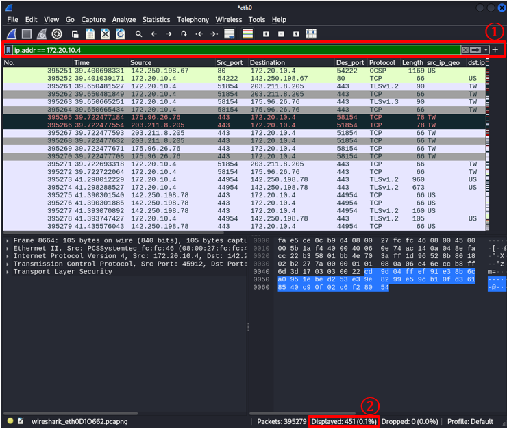 此時,可清楚側錄到來自Ubuntu主機(172.20.10.4)的封包,證明攻擊者已能攔截原本不屬於其連接埠的資料,達成被動監聽效果,短時間內,都可以側錄到阿明發送與接收的封包。針對大量的封包資料,阿建在搜索欄位輸入指令「ip.addr == 172.20.10.4」來過濾發送到IP位址為172.20.10.4的封包,如圖9①、②所示。