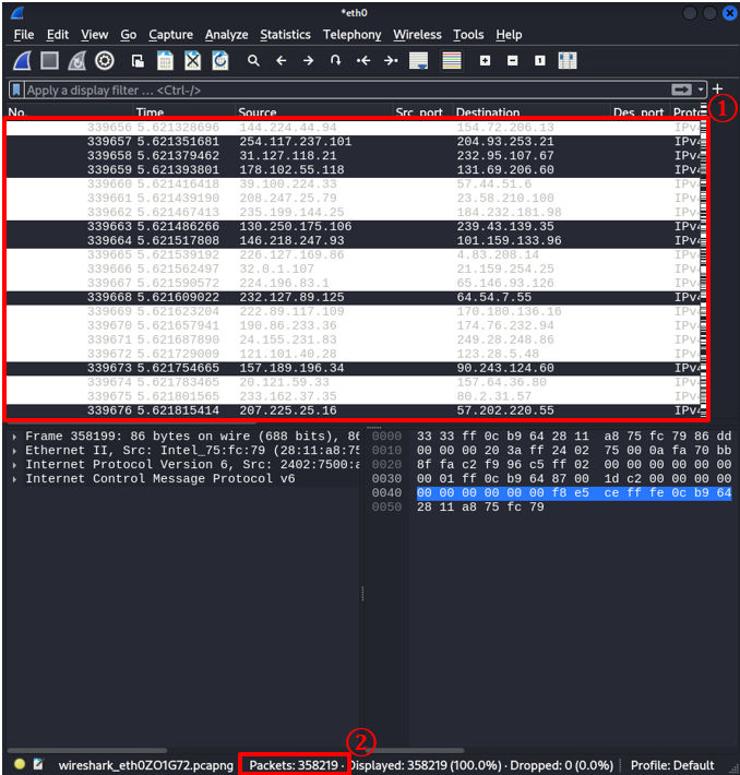 圖8 Wireshark顯示側錄到的封包數量來到358,219則封包。