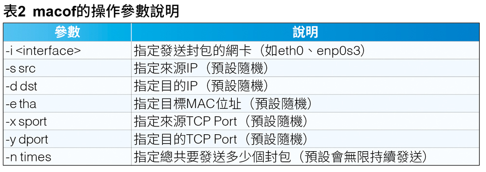 鎖定好阿明的IP位址後,阿建著手準備進行MAC Flooding攻擊。阿建準備利用Kali Linux工具macof來發送大量偽造封包,利用短時間內多個不同的MAC位址的封包來占滿MAC Table。為了操作順利,阿建首先詳閱了macof的操作說明,得知除了需要設定目標網卡外,其餘預設皆為隨機,除了要模擬攻擊模式外,可以不用另外設置,相關參數則如表2所示。