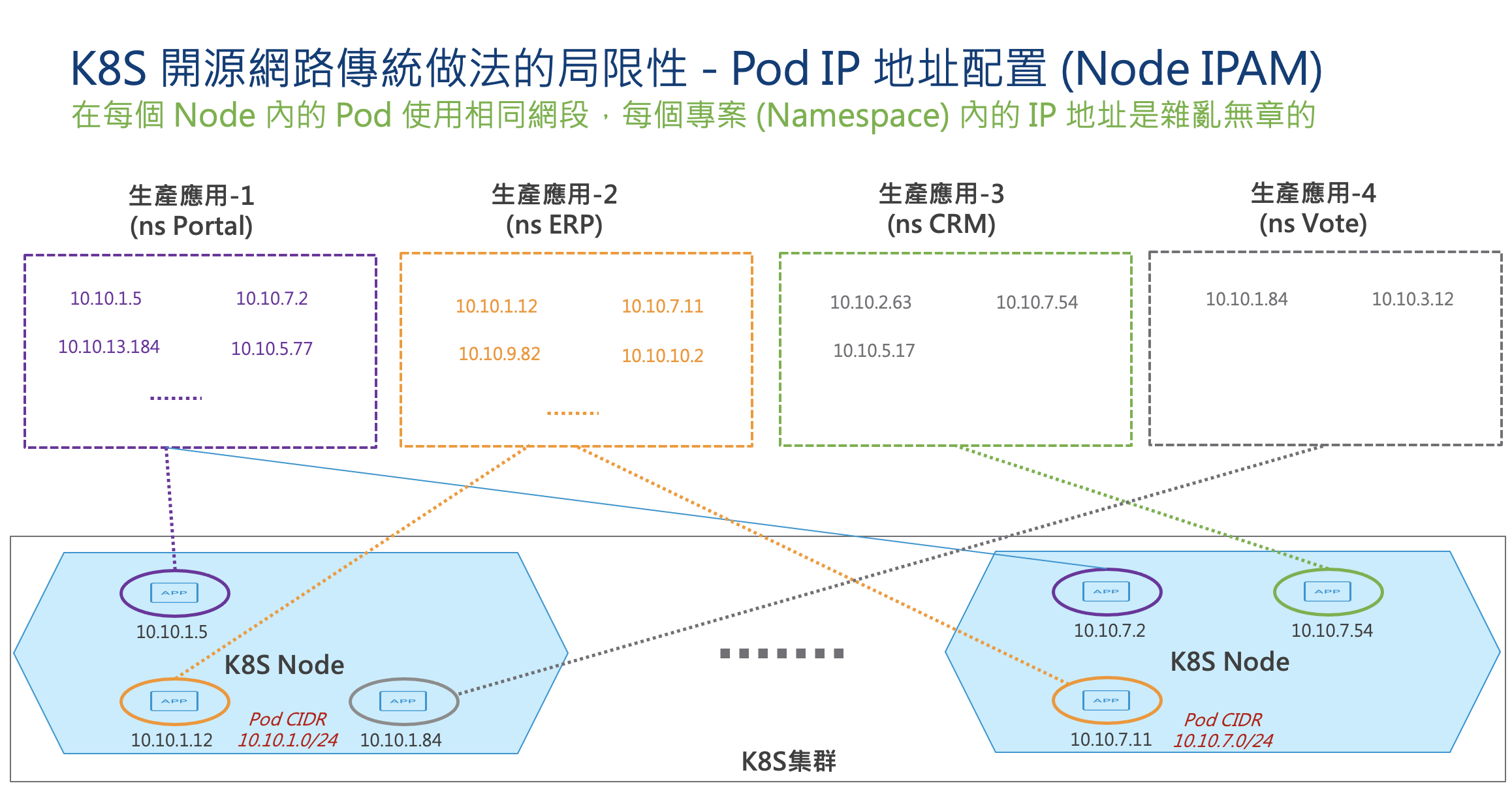 ‧在同一個Namespace(同一個Project、應用)內,各個Pod拿到的IP地址是混亂的,例如ERP Namespace內的Pod,拿到的IP來自不同網段,包括10.10.1.12、10.10.7.11、10.10.9.82、10.10.10.2。