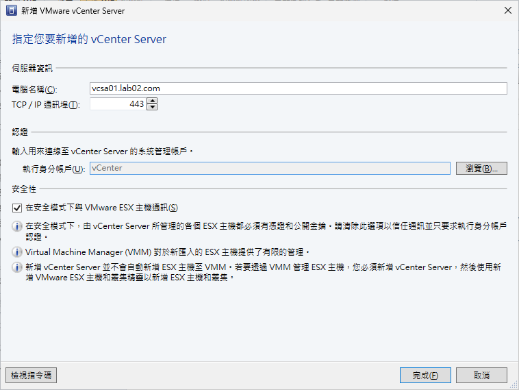 如圖3所示,在「指定您要新增的vCenter Server」頁面中,於「電腦名稱」欄位中輸入vCenter Server的FQDN,若TCP/IP通訊埠(Port)使用非預設的443,也要記得修改。接著,在「執行身分帳戶」欄位右側按下〔瀏覽〕按鈕,挑選身分帳戶,以及在「安全性」區域內勾選「在安全模式下與VMware ESX主機通訊」設定,最後按下〔完成〕按鈕。