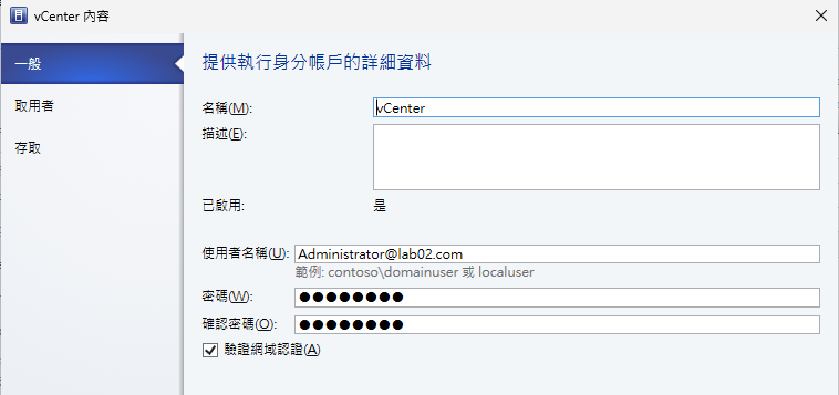 接著,在「一般」頁面中,如圖2所示,依序設定名稱、描述、使用者名稱以及兩次的密碼輸入,並勾選「驗證網域認證」設定,而其中的使用者名稱與密碼必須輸入vSphere的SSO網域管理員帳密。再連續按下〔下一步〕按鈕,便完成設定。