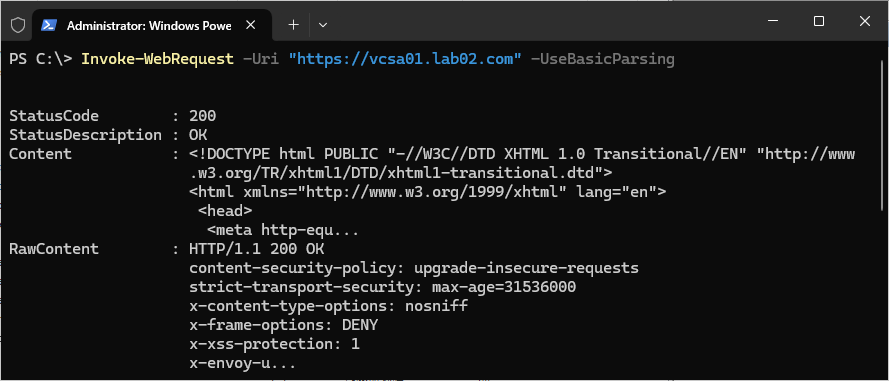 Invoke-WebRequest -Uri "https:// vcsa01.lab02.com" -UseBasicParsing