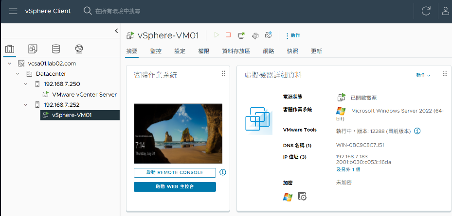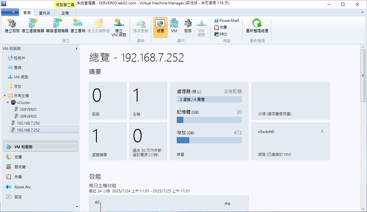 可是在SCVMM 2025的管理機制中不太一樣,因為它必須自行手動新增所需要管理的ESXi主機。先回到vSphere Client來查看,目前連線的這台vCenter Server中所關聯的ESXi主機有哪一些。如圖7所示,可以發現192.168.7.250與192.168.7.252兩台ESXi主機,其中192.168.7.252這台ESXi主機,還有一台預先準備好的vSphere-VM01虛擬機器。