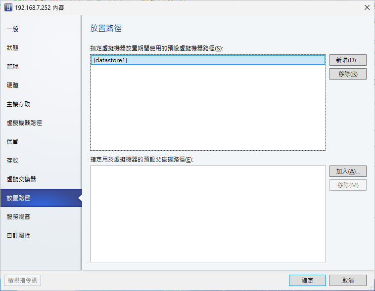 如圖12所示,在「放置路徑」頁面中,首先可以指定虛擬機器在放置期間,所要使用的預設虛擬機器路徑,也就是在此主機新增虛擬機器時預設能夠選擇的存放路徑清單,只要按下〔新增〕按鈕,就可以添加更多vSphere的資料存放區。另外,這裡也能夠加入或移除用於虛擬機器的預設父磁碟路徑。