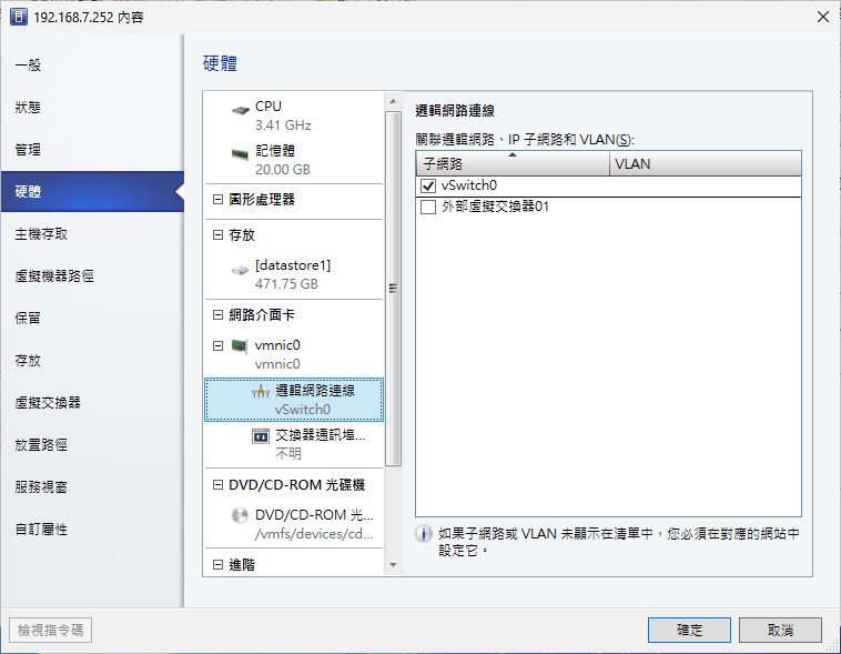 接著,開啟該主機的內容,在「一般」頁面中可以查看此主機所屬的網域名稱、位置、描述以及目前可用的記憶體與存放裝置大小。此外,還可以查看或修改硬體資源的配置,例如可能需要調整CPU或記憶體的配置,或是如圖11所示調整邏輯網路所關聯的虛擬交換器連線。
