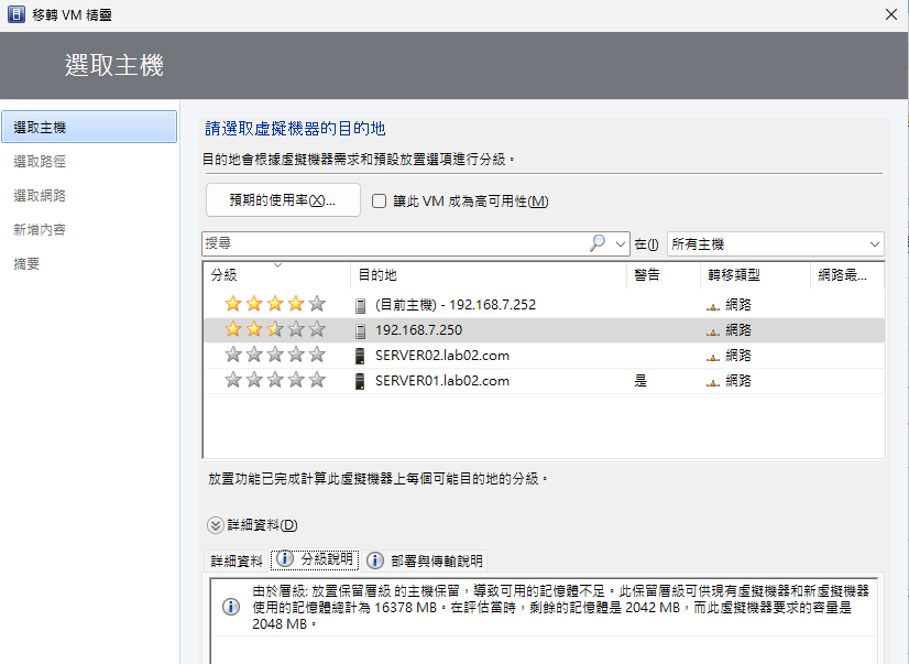 緊接著,在「選取主機」頁面中,如圖14所示,可以查看目前所有目的地主機的分級,顯示越多顆星星的主機,就表示越適合運行此虛擬機器,若是連一顆星星都沒有顯示,則代表該主機完全不能夠運行此虛擬機器。