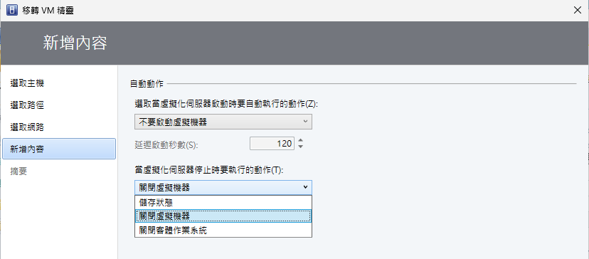 在「選取網路」頁面中,則指定移轉後的虛擬機器所要使用的虛擬網路。若虛擬機器有配置多個網路介面卡,將可以為不同的網路介面卡設定連接不同的虛擬交換器。如圖15所示,在「新增內容」頁面中,可以自行決定當虛擬機器移轉到目標主機後,若目標主機啟動後是否要自動啟動此虛擬機器,以及在目標主機進行關機時,是否要自動儲存狀態、關閉虛擬機器或是關閉客體作業系統。