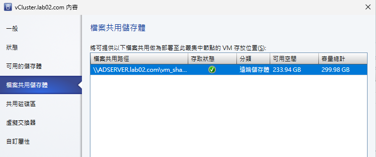 由於Hyper-V叢集架構下的虛擬機器高可用性機制,這裡是採用SMB的共用位置方式來達成,因此必須確認在叢集內容的「檔案共用儲存體」頁面中,如圖17所示,已新增所有會使用到的檔案共用路徑,如此一來後續才能夠將轉換進來的vSphere虛擬機器,選擇存放於選定的檔案共用路徑中。