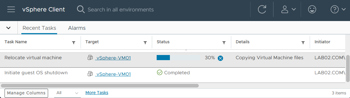 執行虛擬機器移轉時,整個過程除了能夠在「作業」視窗中查看外,也可以回到vSphere Client網站中,如圖16所示查看「Recent Tasks」頁面,其中在「Task Name」欄位中所出現的「Relocate virtual machine」工作名稱,即是目前虛擬機器的移轉進度。