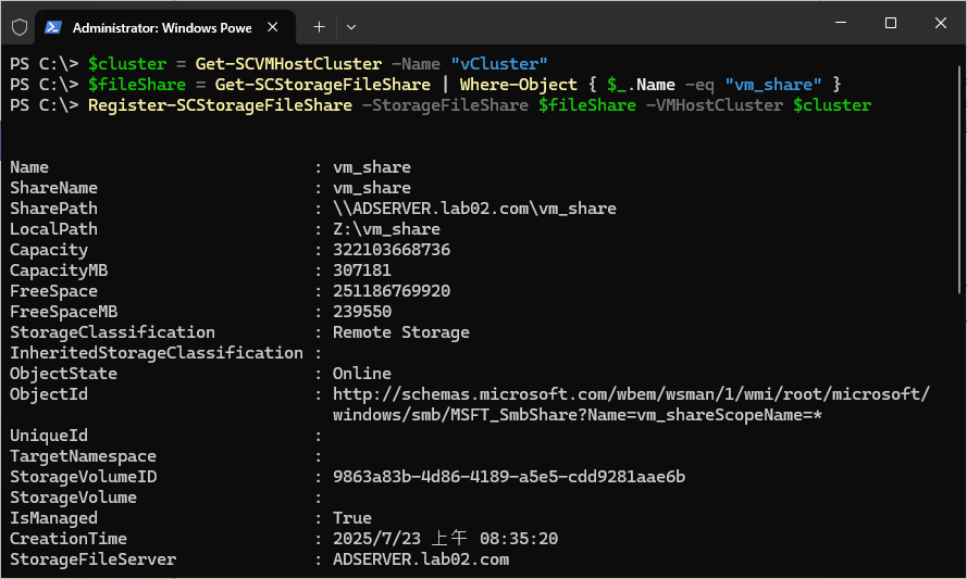 $cluster = Get-SCVMHostCluster -Name "vCluster" $fileShare = Get-SCStorageFileShare | Where-Object { $_.Name -eq "vm_share" } Register-SCStorageFileShare -StorageFileShare $fileShare -VMHostCluster $cluster