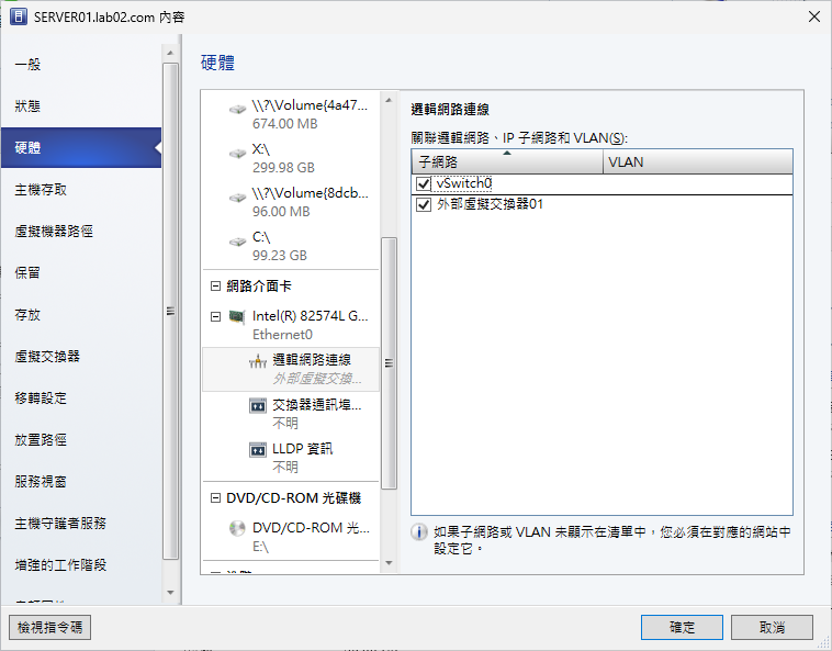 緊接著,還有一項重要的事前準備工作要完成,那就是目的地Hyper-V主機的虛擬交換器關聯設定。如圖19所示,開啟該主機「內容」的「硬體」頁面,找到位於「網路介面卡」的「邏輯網路連線」設定。在此必須將vSphere主機的vSwitch虛擬交換器勾選,如此才能夠讓後續vSphere虛擬機器的轉換過程不會出現找不到網路連線方面的錯誤。
