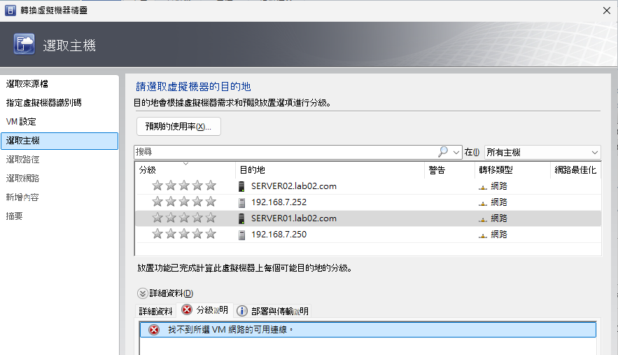 在「選取主機」頁面中,如果發現目前沒有可用的目的地主機可選,便要注意下方的「詳細資料」說明才能加以解決。如圖21所示,在此範例中顯示「找不到所選VM網路的可用連線」,這表示尚未完成目的地Hyper-V主機的邏輯網路設定,以致來源虛擬機器沒有可用的目的地網路能夠使用。