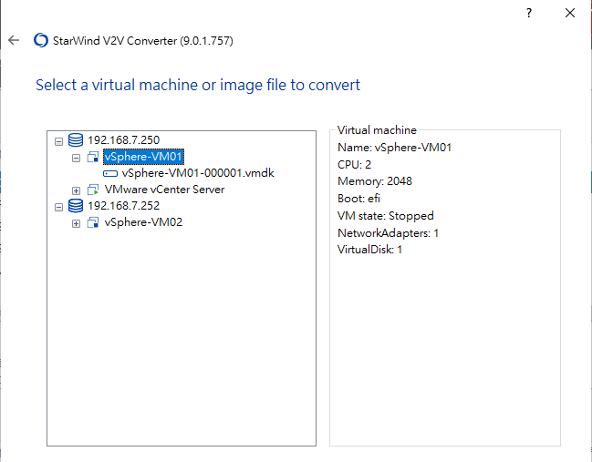 如圖23所示,在「Select a virtual machine or image file to convert」頁面範例中,便可以查看到在這個vSphere架構下目前有兩台ESXi主機可以選擇。當展開任一主機節點,就能夠選取所要轉換的虛擬機器,並且查看到選定虛擬機器的處理器、記憶體、開機模式、目前狀態、網卡數量以及虛擬磁碟數量。