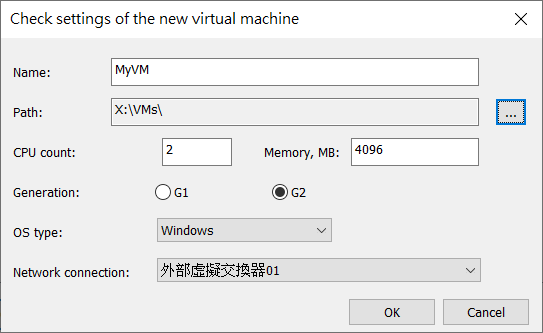 如圖27所示,在「Check settings of the new virtual machine」頁面中,便是建立新虛擬機器的設定頁面。依序完成虛擬機器名稱、路徑、CPU數量、記憶體大小、世代、作業系統類型以及虛擬交換器的設定,再按下〔OK〕按鈕。