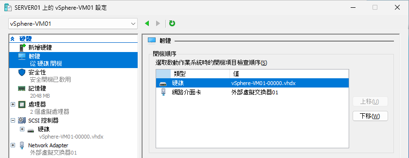 完成vSphere虛擬機器的轉換後,就可以開啟「Hyper-V管理員」介面來查看此虛擬機器的內容。如圖25所示,在此虛擬機器的內容中,可根據需求進一步調整韌體、記憶體、處理器、控制器、硬碟以及網卡等配置。