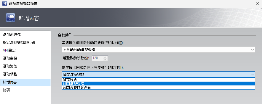 在「選取網路」頁面中,則設定每一個網路介面卡所要關聯的Hyper-V虛擬交換器以及VLAN的設定。如圖22所示,在「新增內容」頁面中,則決定對於轉換後的虛擬機器,在目的地Hyper-V主機的運行過程中,當主機啟動時是否要自動啟動此虛擬機器,以及當主機停止時是否要自動儲存虛擬機器狀態、關閉虛擬機器或是關閉客體作業系統,設定完畢按下〔下一步〕按鈕。接著,在「摘要」頁面中確認上述步驟設定皆無誤後,可決定是否要勾選「部署後立即啟動虛擬機器」設定,最後按下〔建立〕按鈕。