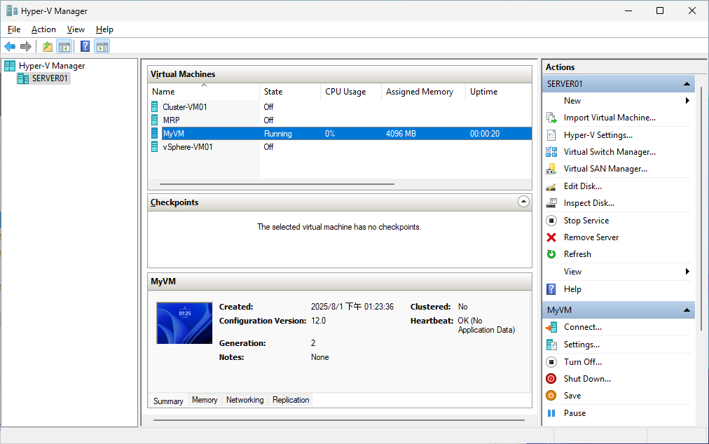回到「Hyper-V管理員」介面的主頁面後,可以對於此虛擬機器進行相關的操作管理,包括連線、關閉、關機、儲存、暫停、重設、檢查點、移動以及匯出等等。
