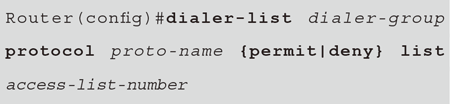 在上面的指令格式中,粗體為關鍵字,不可變更,而斜體部分是要替換成真正要執行的資料。這個指令為dialer-list,而後面可以指定網路協定,接著就是指定是要允許(Permit)還是拒絕(Deny)。