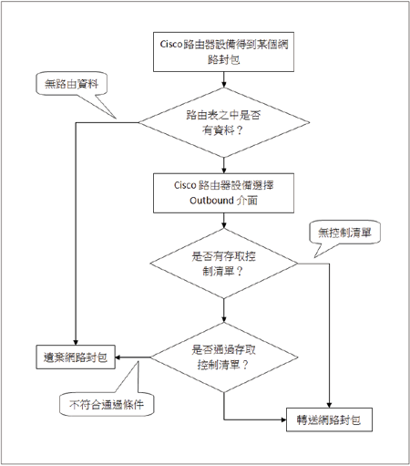假設一個Cisco路由器設備沒有設定存取控制清單,當拿到一個網路封包時,會做怎樣的處理,其流程如下圖所示: